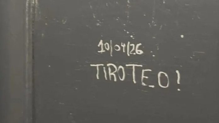 Tal como se observa en imágenes difundidas, en el baño femenino del colegio, ubicado en la calle Belgrano al 900 de la localidad de La Paz, alguien escribió “10/04/26 tiroteo!”. Poco después, llegaron mensajes en el mismo tono vía e-mail, enviados desde dos direcciones diferentes.