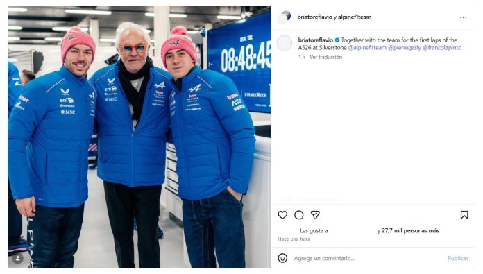 “Junto con el equipo para las primeras vueltas del A526 en Silverstone”, escribió Flavio Briatore en su cuenta oficial de Instagram debajo de una foto junto con sus pilotos titulares, Franco Colapinto y el francés Pierre Gasly. El líder de la escudería con sede en Enstone además compartió una storie con el corredor argentino.