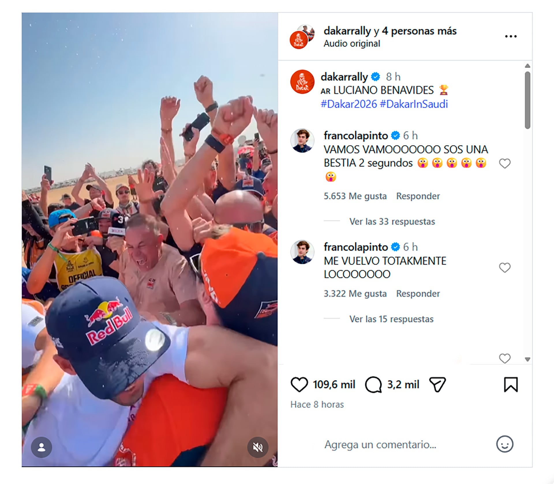 El respaldo de Colapinto no se limitó a un solo mensaje. A lo largo de la jornada, el piloto argentino continuó sumando publicaciones en reconocimiento tanto a Luciano como a Kevin Benavides, bicampeón del Dakar en 2021 y 2023. “Todo al 2 loco, que lindo, que lindo. Son unos cracks, aguante Argentina!!!!!!!!!!! A disfrutar”, comentó Colapinto en otra publicación, resaltando el orgullo nacional que despertó.