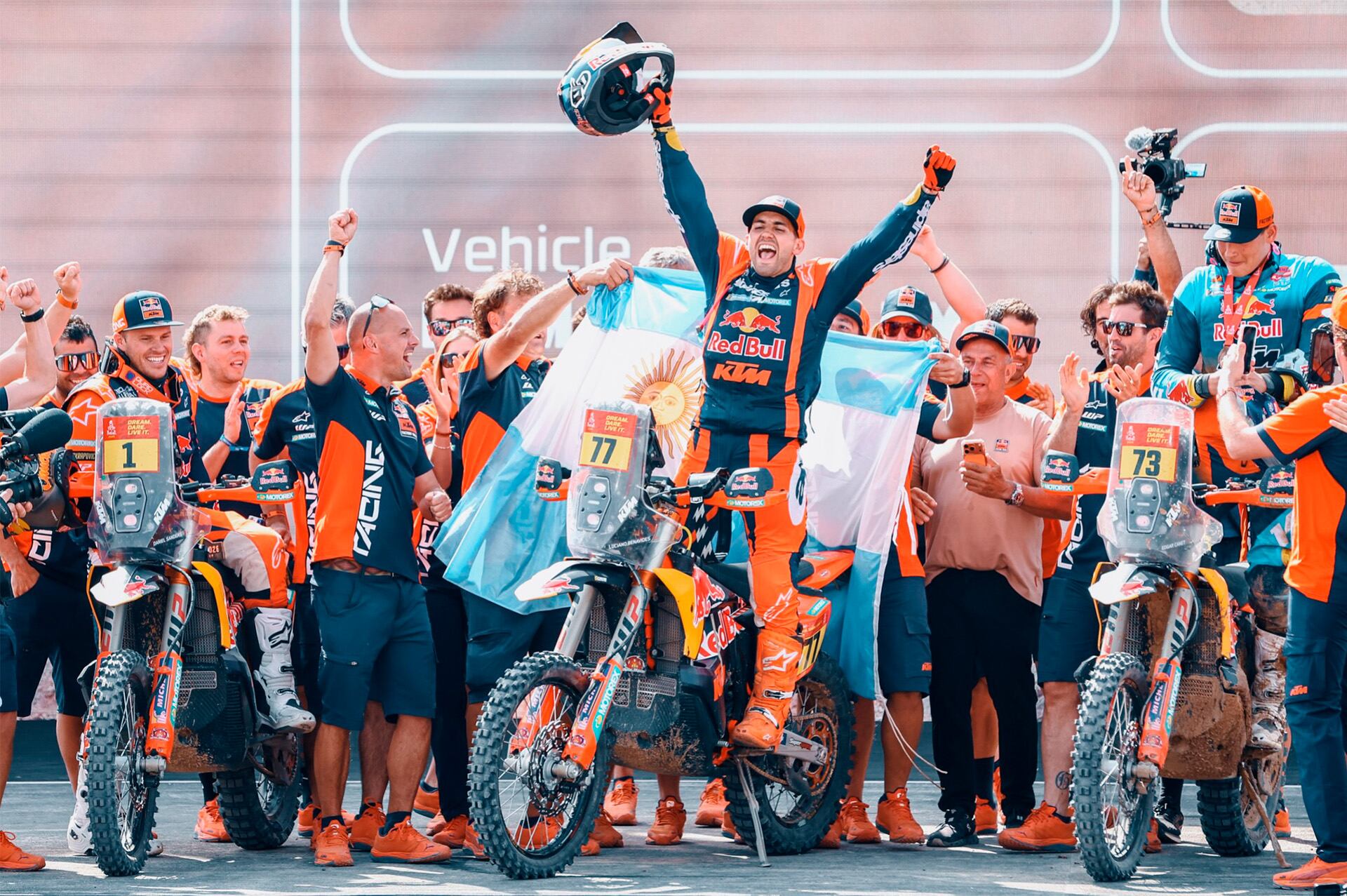 En el final, los medios agolpados no podían creer la noticia que estaba llegando: Benavides era el ganador por solo dos segundos. Se produjo el éxtasis y tras bajarse de su moto contó que “en los últimos cinco kilómetros hubo que agarrar una pista al lado del Mar Rojo. Yo tomé la pista buena y vi que Ricky volvía en contramano, porque por otra pista al costado ya no podía cruzarse porque había agua. Así que lo primero que dije fue: ‘No puede ser que sea él. Debe ser un turista paseando en moto’. La probabilidad que fuese Brabec era casi imposible. Pero ese 1% sucedió y de ahí al final, fui a fondo”.