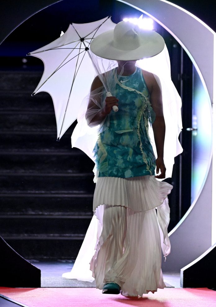 La colaboración culminó en la creación de un atuendo que combinó referencias a la medusa y la mariposa, símbolos de transformación y energía. El conjunto diseñado por Wun para Osaka incluyó una minifalda plisada sobre pantalones anchos, característica del meticuloso trabajo del modisto, y un sombrero de ala ancha con un velo blanco vaporoso, que le otorgó un aire de misterio y sofisticación. Sobre el sombrero y la sombrilla, el diseñador sumó mariposas, rindiendo homenaje a aquel episodio de 2021.