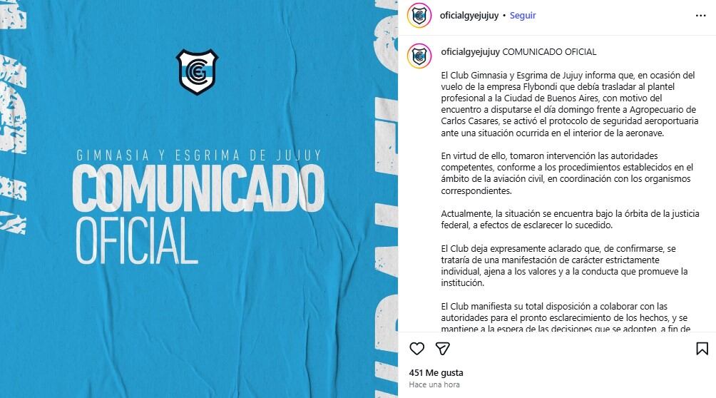 El comunicado de Gimnasia y Esgrima de Jujuy tras el episodio en el avión (Instagram @oficialgyejujuy)