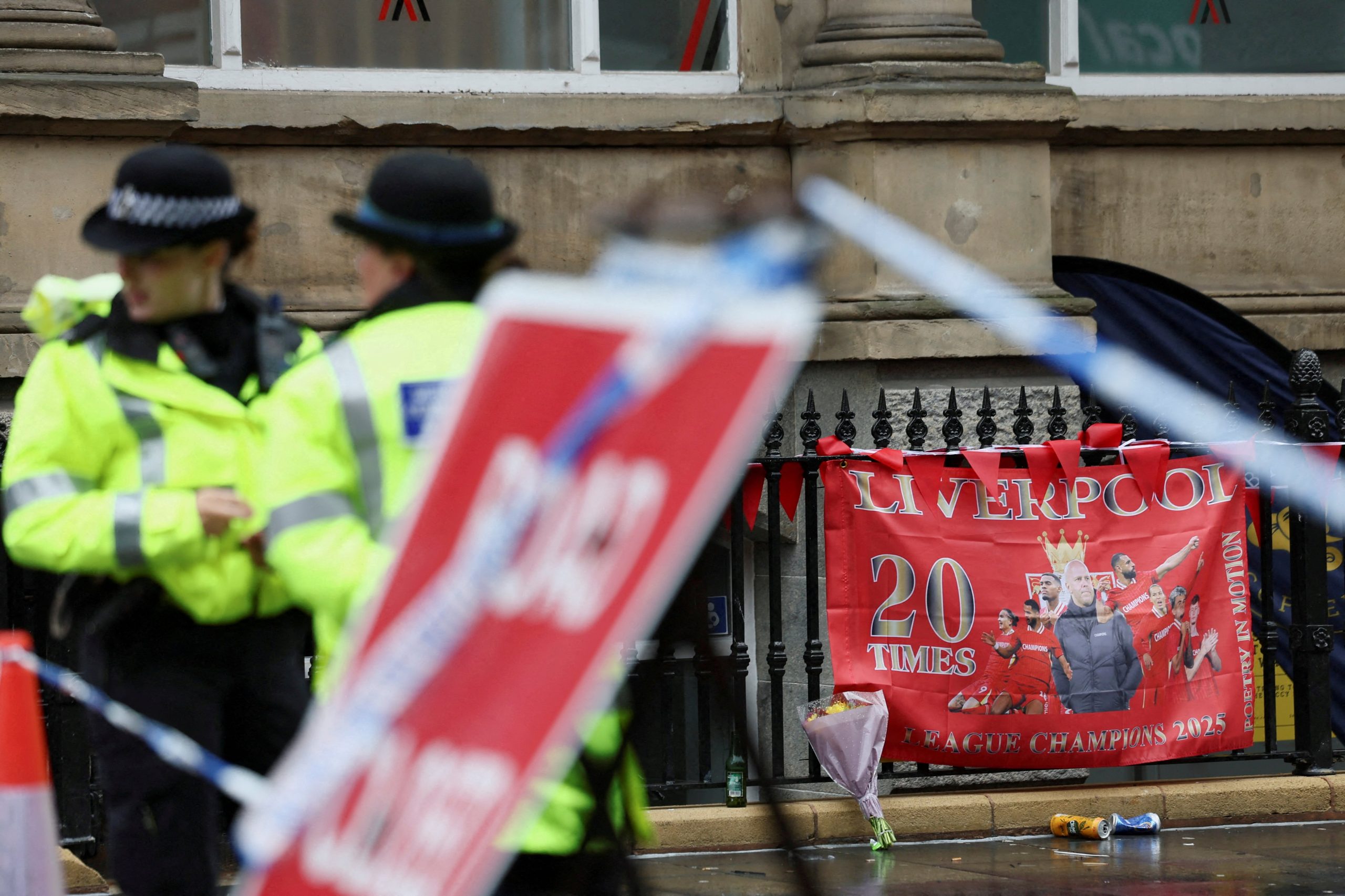 Agentes de policía operan mientras se ve una bandera del Liverpool FC al fondo en el lugar de un incidente donde un automóvil atropelló a una multitud de fanáticos que celebraba el título de la Premier League (REUTERS/Isabel Infantes/Foto de archivo)