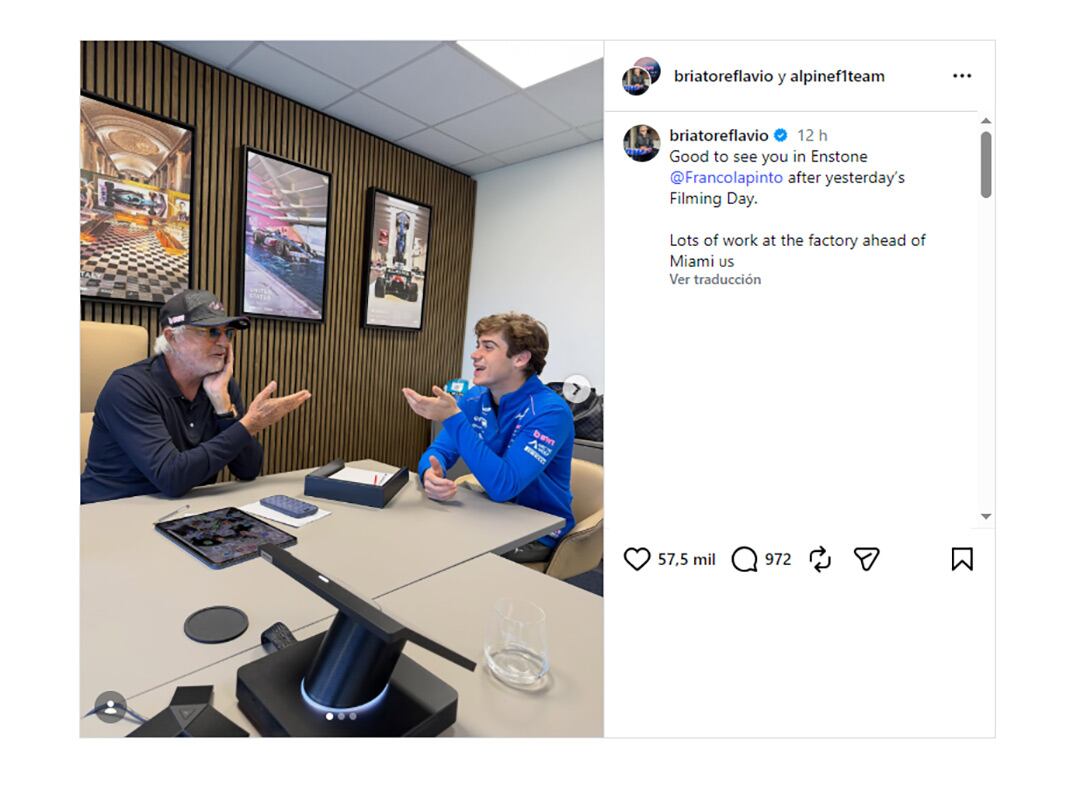 El italiano compartió públicamente su entusiasmo y apoyo al joven piloto en una publicación conjunta con Alpine en redes sociales, donde ambos aparecen sonrientes en la base del equipo francés. “Qué bueno verte en Enstone, Franco Colapinto, después del Filming Day de ayer. Mucho trabajo en la fábrica por delante antes de Miami”, expresó el empresario para remarcar la preparación y el esfuerzo que requiere competir en la máxima categoría.