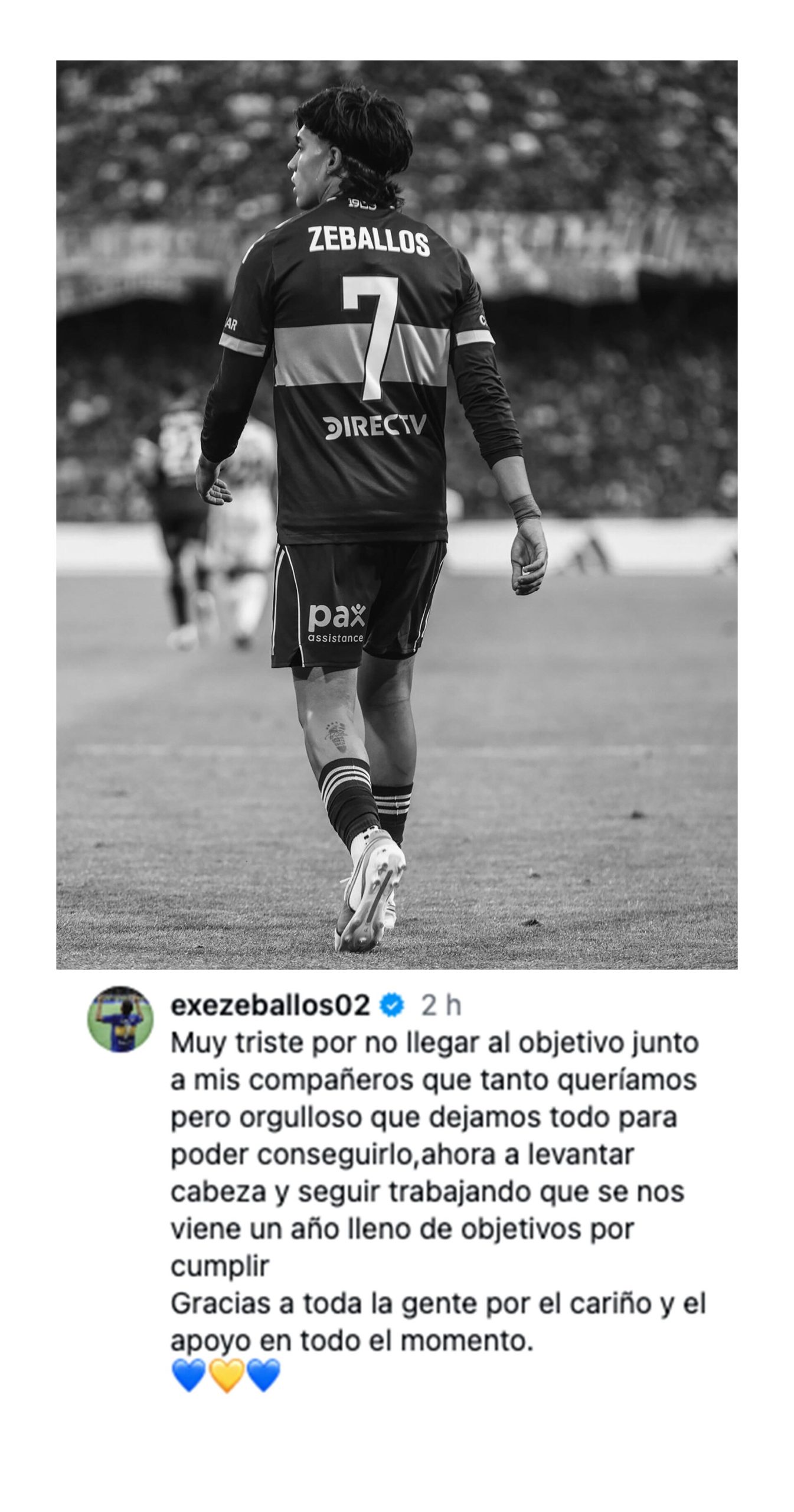 En el cierre de su mensaje, Zeballos también se dirigió a los hinchas del Xeneize, agradeciéndoles el respaldo recibido. “Gracias a toda la gente por el cariño y el apoyo en todo el momento”, escribió el jugador surgido de las divisiones inferiores del club.