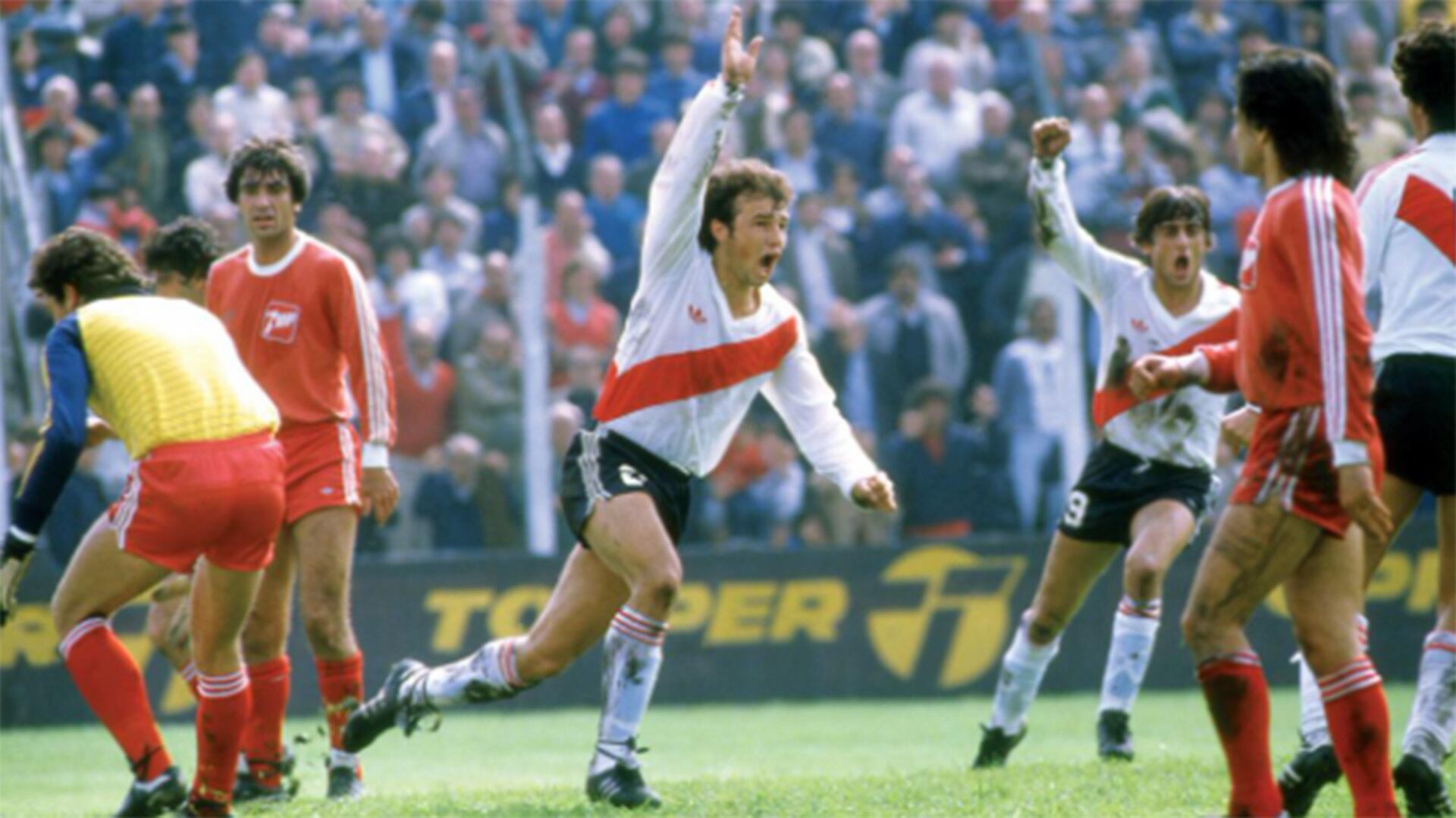 Cacho Borelli festejando un gol en River. Por detrás aparece Enzo Francescoli (Foto El Gráfico)