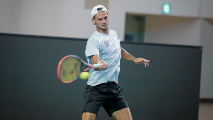 Juan Pablo Ficovich trabaja en cancha en el Gimnasio Gijang, enfocado en su estreno con la camiseta argentina en la serie de Copa Davis ante Corea del Sur (Crédito: Prensa AAT)