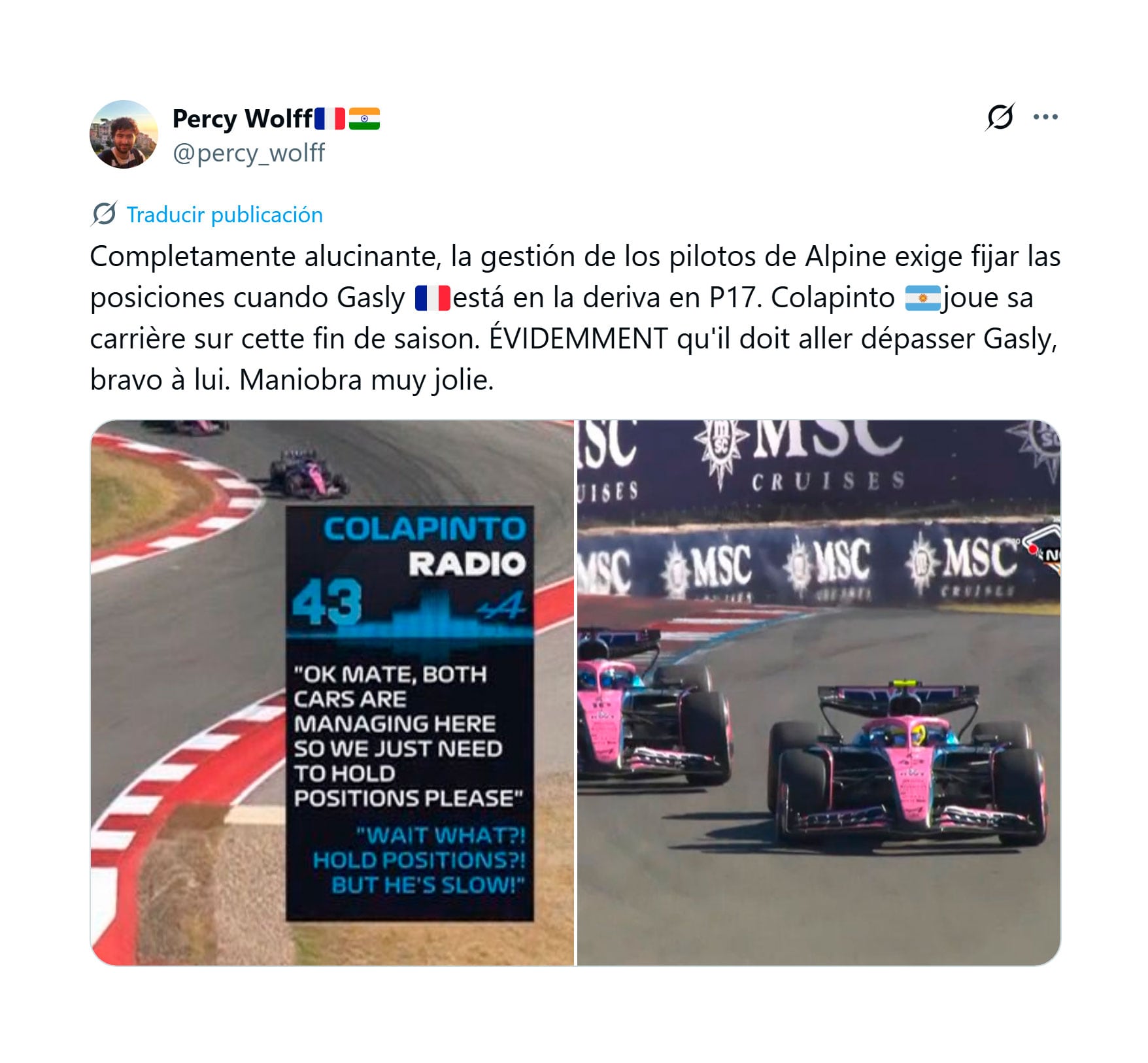 “Absolutamente alucinante la gestión del piloto de Alpine, que obliga a congelar posiciones mientras Gasly se queda a la deriva en P17. Colapinto se juega su carrera al final de la temporada. Obviamente, tiene que superar a Gasly, ¡enhorabuena! Muy buena jugada”, escribió en su cuenta oficial de X (antes Twitter).