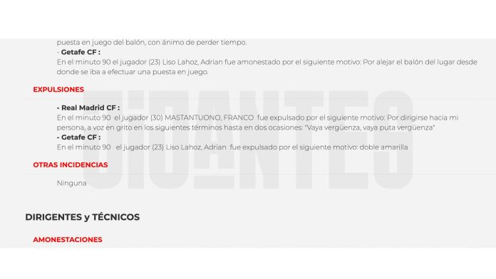 El acta del árbitro Muñiz Ruiz por el insulto de Mastantuono (Crédito: @JijantesFC)