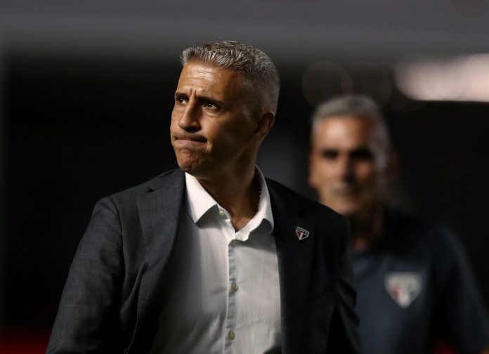 Hernán Crespo habla con Sabino, jugador del San Pablo (REUTERS/Thiago Bernardes)