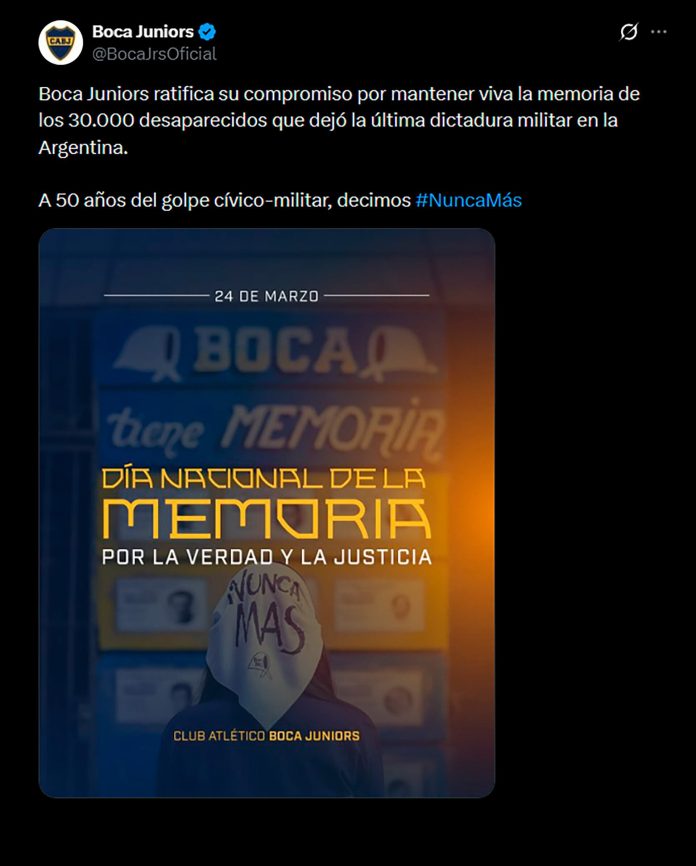 Más allá de estos casos puntuales, en el “Día nacional de la Memoria por la Verdad y la Justicia”, una gran porción de los clubes del fútbol argentino eligieron distintos mecanismos para mostrar su postura en esta fecha. “A 50 años del inicio de la última dictadura militar, River no olvida y reafirma su compromiso histórico por la Memoria, la Verdad y la Justicia. En homenaje a los 30 mil desaparecidos. Nunca Más”, difundieron desde la cuenta oficial de River Plate. “Boca Juniors ratifica su compromiso por mantener viva la memoria de los 30.000 desaparecidos que dejó la última dictadura militar en la Argentina. A 50 años del golpe cívico-militar, decimos Nunca Más”, fue el mensaje desde el Xeneize.