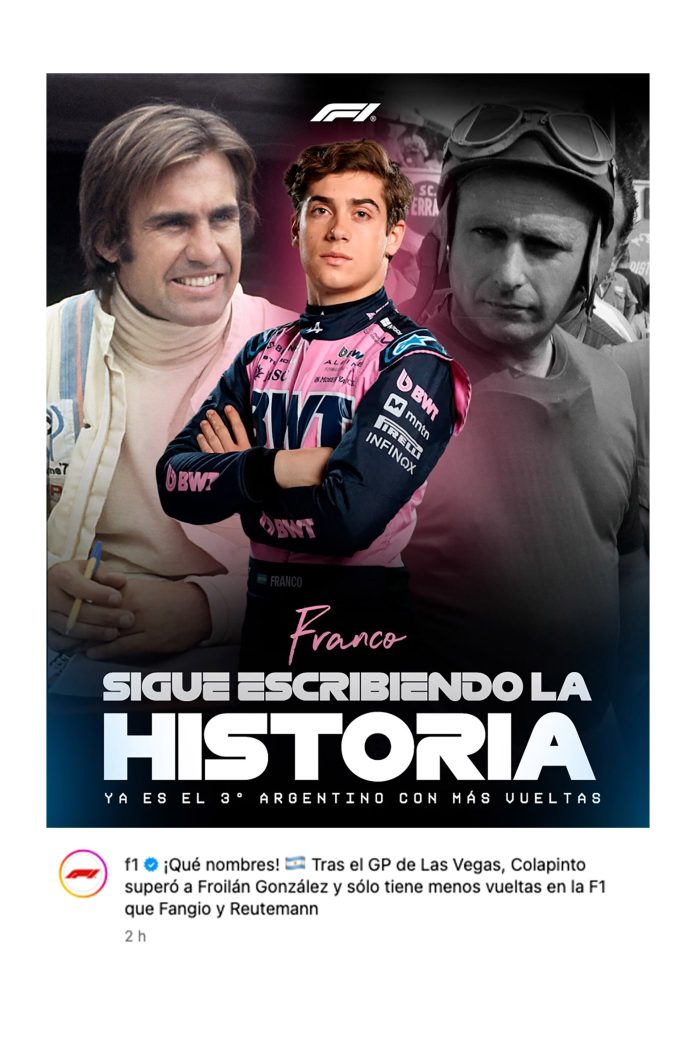 En el plano estadístico, la F1 volvió a poner en valor la trayectoria de Colapinto. A través de sus redes sociales, la categoría destacó que, tras el Gran Premio de Las Vegas, el argentino se convirtió en el tercer piloto nacional con más vueltas completadas en los setenta y cinco años de historia de la F1, solo por detrás de Juan Manuel Fangio y Carlos Reutemann. El mensaje de la organización fue contundente: “¡Qué nombres! Tras el GP de Las Vegas, Colapinto superó a Froilán González y sólo tiene menos vueltas en la F1 que Fangio y Reutemann”. Colapinto quedó con 1.333 vueltas contra 3.022 de Fangio y 6.986 del Lole.