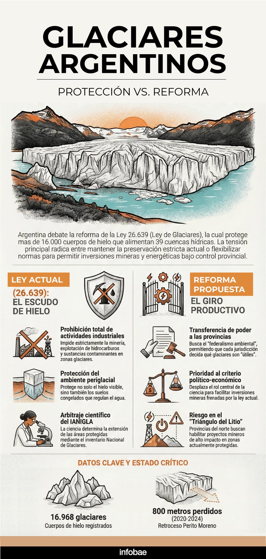 El proyecto tiene como eje que cambia el criterio de protección de los glaciares desde un enfoque científico y uniforme a uno determinado políticamente por cada provincia, lo que implica una mayor discrecionalidad local y una menor tutela ambiental a nivel nacional.