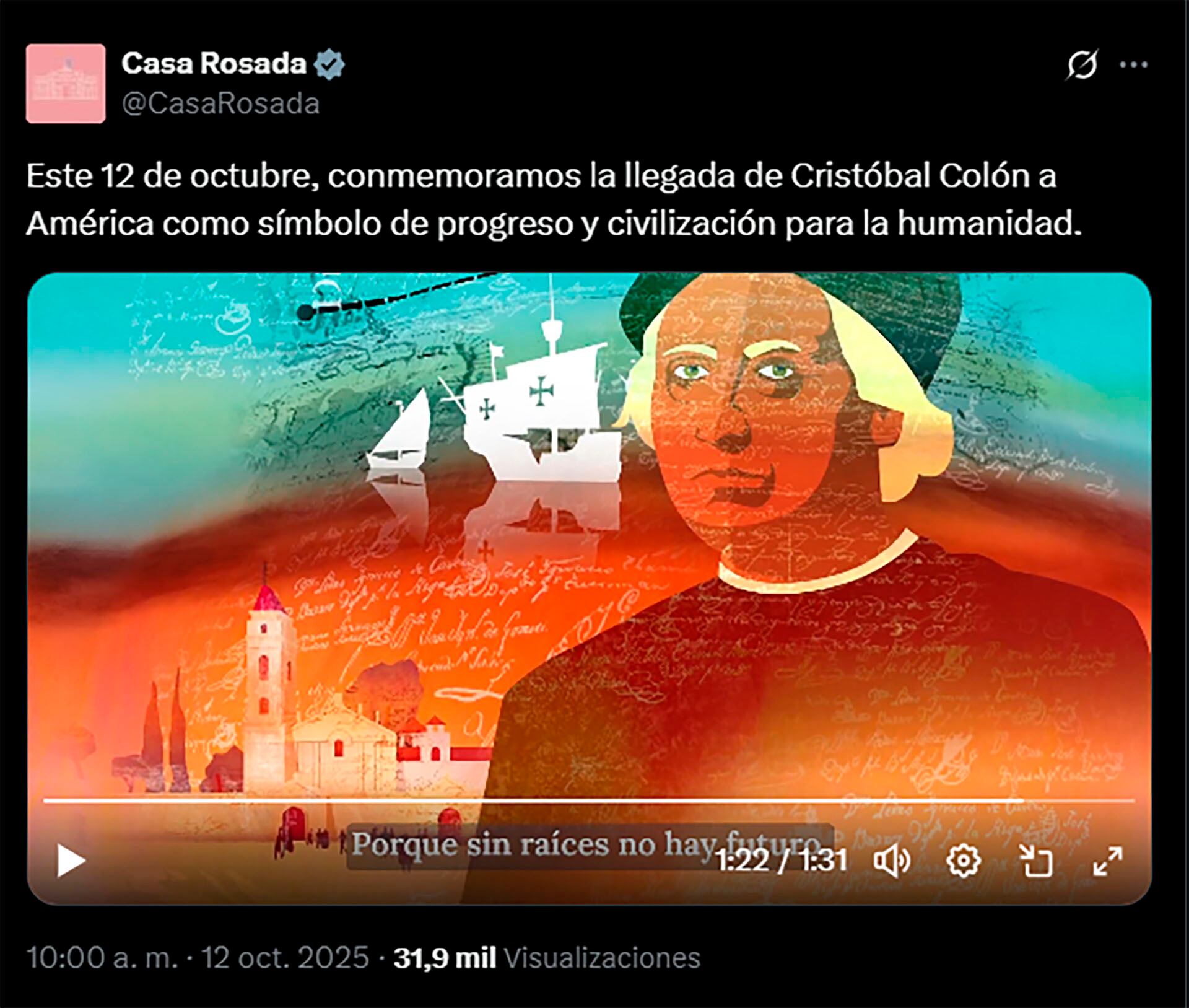“El 12 de octubre de 1492 Cristóbal Colón llegó a América dando inicio a una de las gestas más trascendentales de la historia: el comienzo de un proceso de civilización, orden y progreso que marcaría para siempre el destino del continente”, dice la pieza audiovisual compartida este domingo en la red social X.
