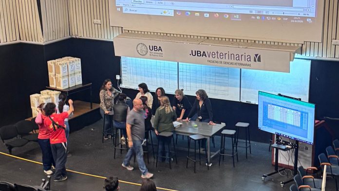 Miembros del equipo electoral organizan y supervisan las mesas y el material en la Facultad de Ciencias Veterinarias de la UBA para las elecciones estudiantiles de abril de 2026.