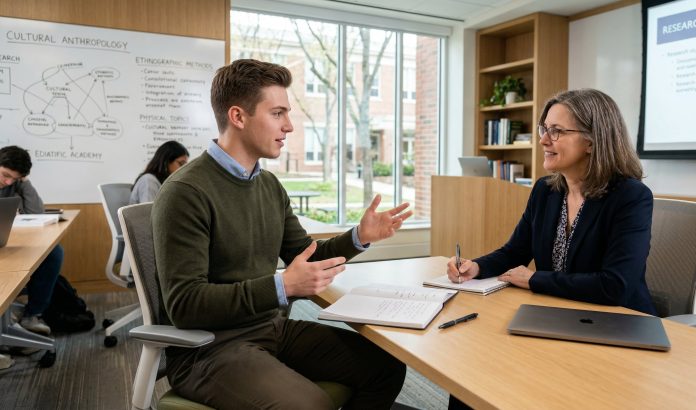 Un estudiante conversa animadamente con una profesora, quien toma notas, durante una sesión académica de Antropología Cultural en un aula moderna equipada con computadoras. (Imagen Ilustrativa Infobae)