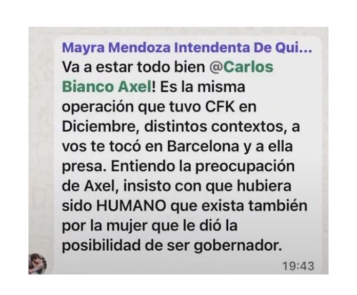 “Va a estar todo bien. Es la misma operación que tuvo Cristina Fernández de Kirchner en diciembre. Distintos contextos: a vos te tocó en Barcelona y a ella presa”, deslizó la ex intendenta de Quilmes, que asumió en diciembre pasado como legisladora provincial. Y el reproche continuó hacia el gobernador bonaerense: “Entiendo la preocupación de Axel. Insisto con que hubiera sido HUMANO que exista también por la mujer que le dio la posibilidad de ser gobernador”.