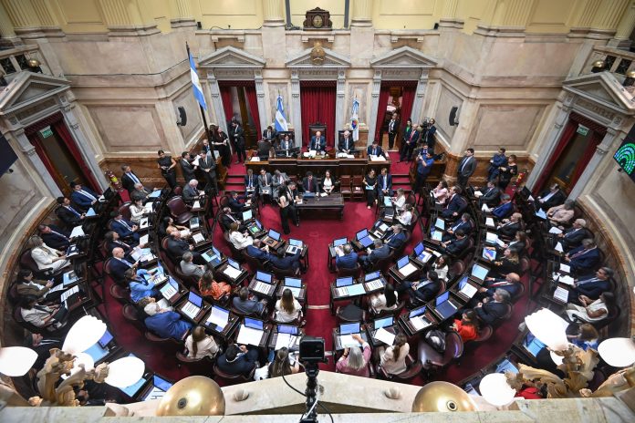 Vista general de la Sesión Pública Especial celebrada el 26 de febrero de 2026 en el Senado de la Nación en Buenos Aires, Argentina, con asistentes y personal trabajando en el recinto. (Comunicación Senado)