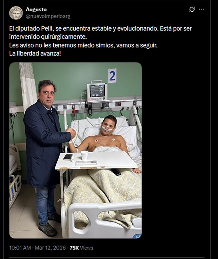 La foto que encabeza esta nota fue difundida por una cuenta de X llamada @nuevoimperioarg, que realizó el posteo cerca de las 10 de la mañana: “El diputado Pelli se encuentra estable y evolucionando. Está por ser intervenido quirúrgicamente. Les aviso: no les tenemos miedo simios, vamos a seguir. ¡La libertad avanza!”, escribió el usuario.