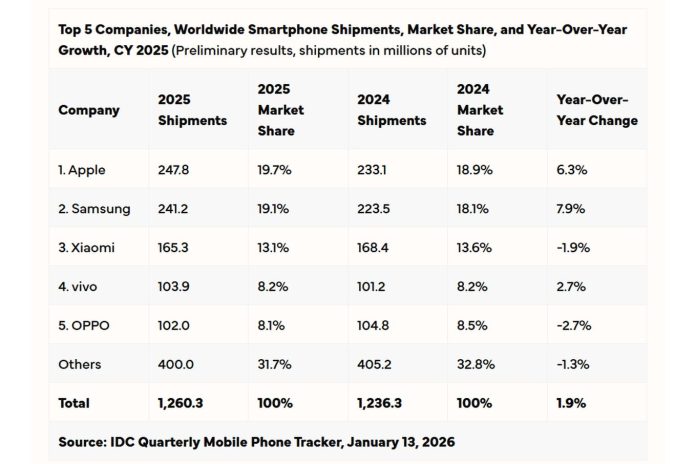 Apple superó a Samsung y fue el mayor fabricante mundial de celulares en 2025