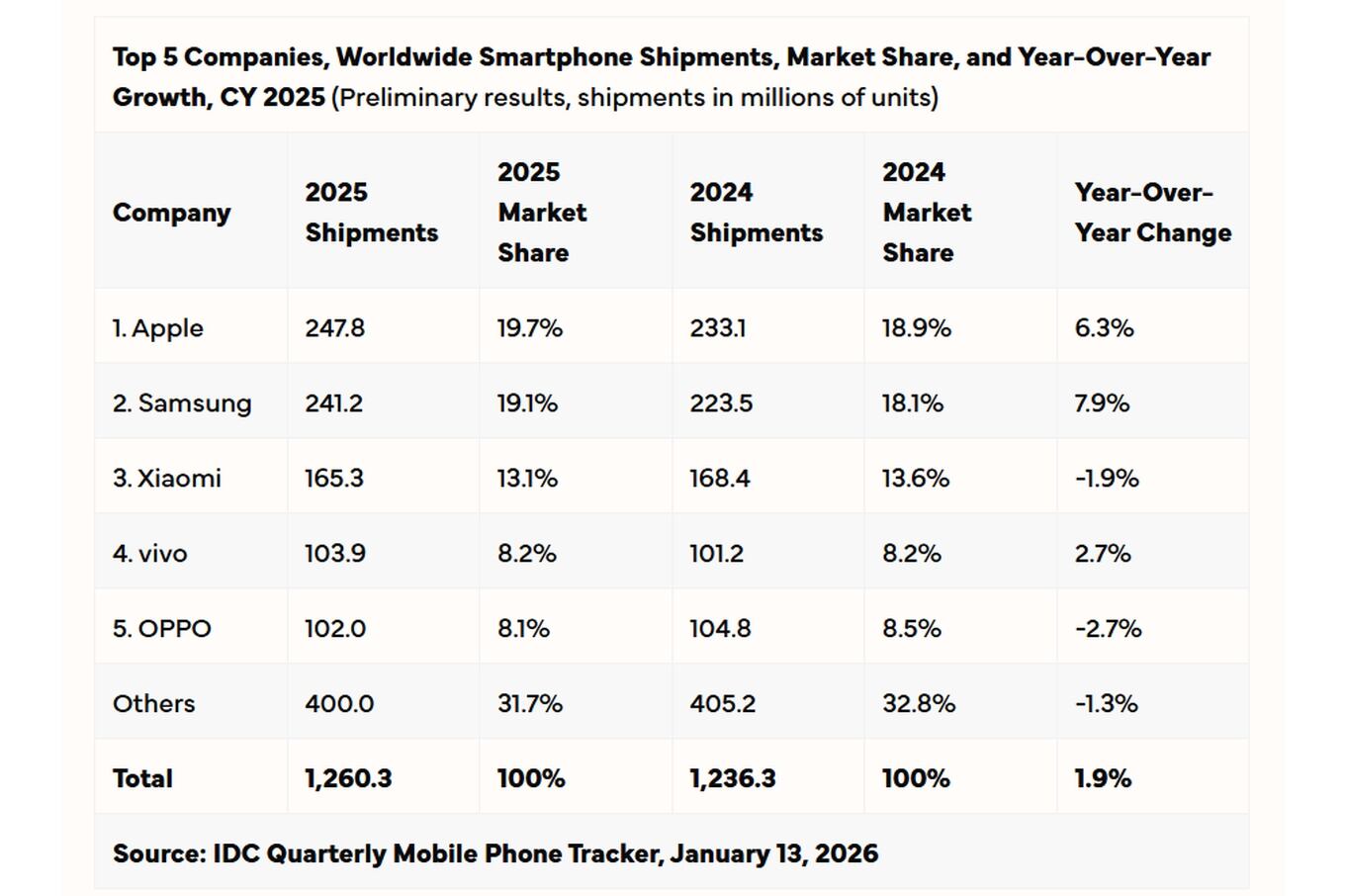 El mercado mundial de smartphones cerró el año 2025 con un cambio de liderazgo y una nota positiva. Según los últimos informes de las consultoras especializadas Counterpoint e IDC, los envíos globales crecieron aproximadamente un 2% interanual durante el año, consolidando una tendencia de recuperación que se intensificó en los últimos meses.