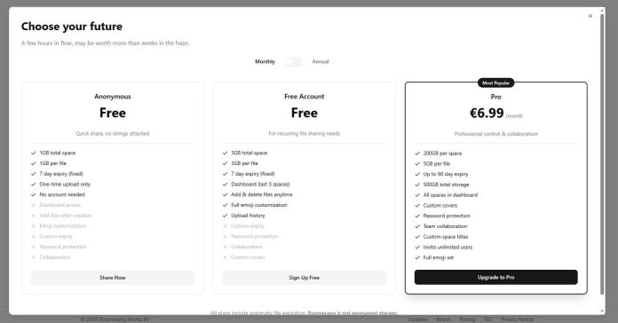 El nuevo servicio ofrecerá hasta 1GB de almacenamiento a los usuarios que no inicien sesión de manera gratuita, y admitirá el envío de archivos de hasta 1GB con un tiempo de expiración de siete días. Sin embargo, ofrecerá también dos modalidades de cuenta con inicio de sesión.