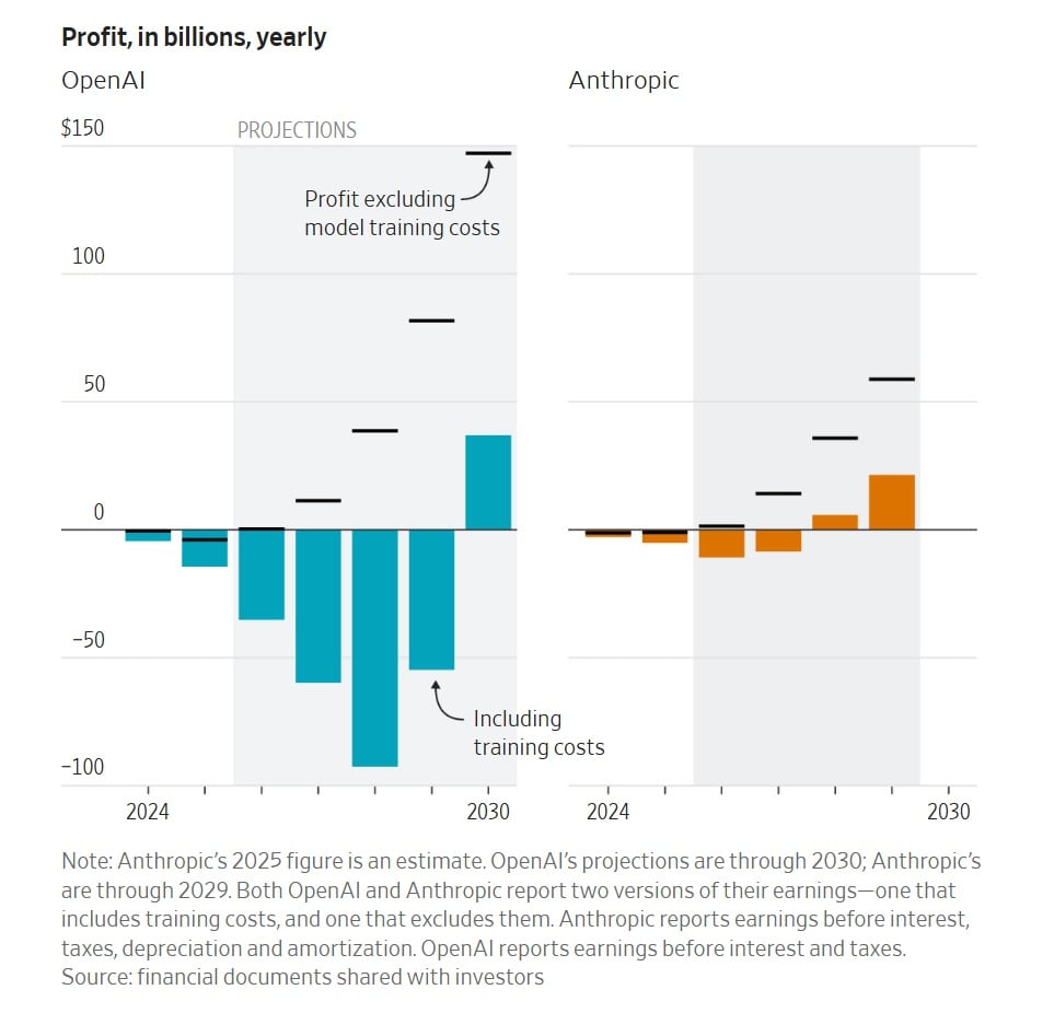 A pesar de estas cifras de facturación, el dinero que ambas compañías pierden día a día es impresionante. OpenAI proyecta perder aproximadamente US$14.000 millones este año. Sus proyecciones de gasto a largo plazo son aún más drásticas, estimando un consumo de efectivo (cash burn) de 115.000 millones de dólares hasta 2029. En 2028 se espera que sus pérdidas operativas alcancen los 74.000 millones de dólares.