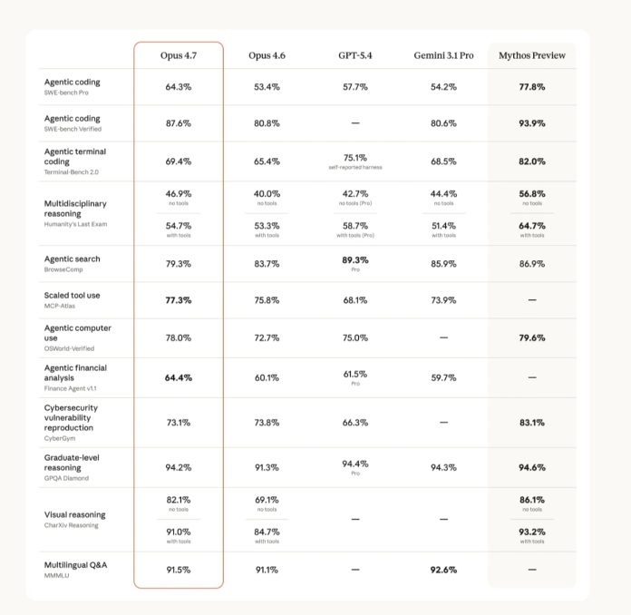 El puntaje de Claude 4.7 comparado con otros motores de inteligencia artificial