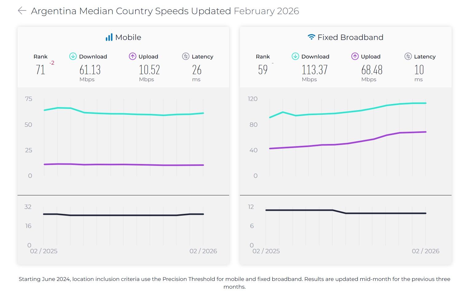 Tomando datos de febrero último, Speedtest calcula que Argentina ocupa el puesto 59 en velocidad de conexión fija a internet, con un promedio de 113,3 Mbps, y en el puesto 71 en conexiones móviles, con una velocidad de descarga promedio de 61,1 Mbps, tomando en cuenta todos los tipos de conexiones de todos los proveedores nacionales de acceso a internet, fijo y móvil.